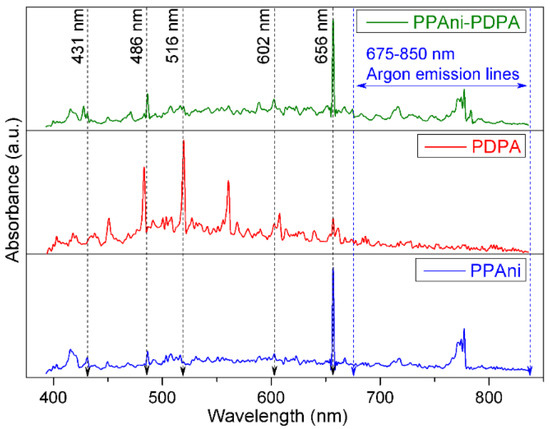 Low-resolution plasma emission spectra, in the range of 400–850 nm, for PPAni, PDPA, and PPAni-PDPA are presented in Figure 2. The spectra were collected during the plasma polymerization process for a discharge current value of 10 mA.