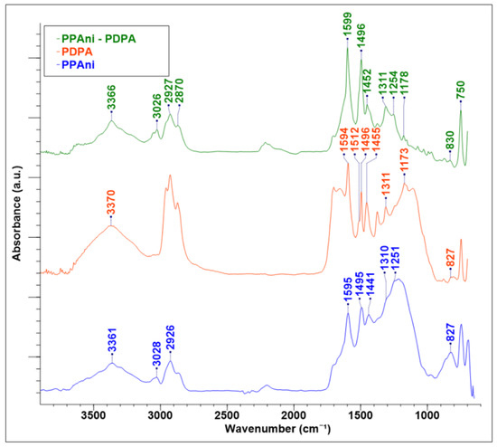 FT-IR spectroscopy studies show that PPAni (Figure 3) has an emeraldine base (PPAni-EB) [37]. The band at 827 cm−1 in PPAni is attributed to aromatic p-substituted rings, indicating a low crosslinking in the polymer structure. The C–N groups are present in the IR spectra, with bands at 1251 and 1310 cm−1, respectively. The bands at 1495 and 1595 cm−1 represent the contributions from aromatic and quinoid groups, respectively. In addition, the 1441 cm−1 band corresponding to C–C asymmetric ring vibrations gives supplemental information about enchained aromatics and not crosslinking. The bands at around 2926 and 3028 cm−1 are typical for C–H and NH2 stretching vibrations and a small amount of substitution in the ortho and meta positions of the aromatic rings. The N–H stretching band at 3361 cm−1 is well resolved.