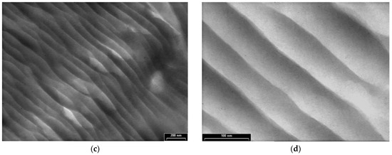 TEM images for PDPA are presented in Figure 5 at three magnifications, with scale bars of 1000 nm (Figure 5a,b), 200 nm (Figure 5c), and 100 nm (Figure 5d); they point out another type of morphology, totally different from that of the PPAni polymer. The PDPA films show morphologies that highlight relatively ordered structures, similar to ultra-long cylindrical micelles with diameters of approximately 30 nm. The organization of them in relatively ordered or aggregated structures can be observed.