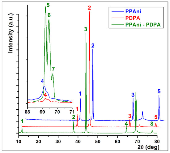 In Figure 7, X-ray diffractograms of PPAni, PDPA, and PPAni-PDPA films are presented. It can be observed that most of the diffraction lines are common to the three structures. In the case of the PPAni-PDPA structure, a distinct line appears, corresponding to an interchain distance of 0.756 nm and a size of the ordered domains of 56.39 nm. Additionally, the line corresponding to an interchain distance of around 0.135 nm shows three well-defined splits.