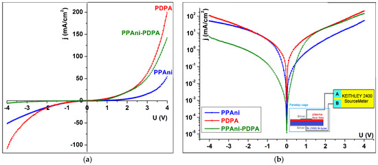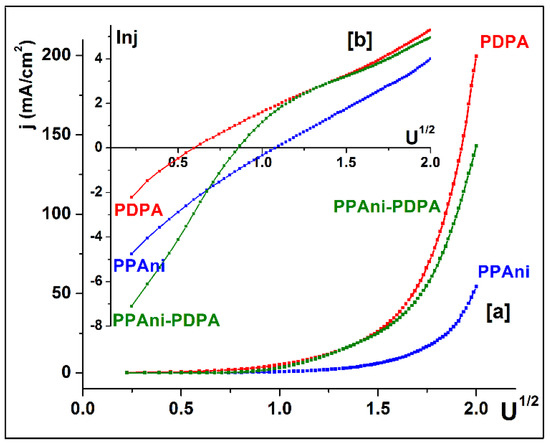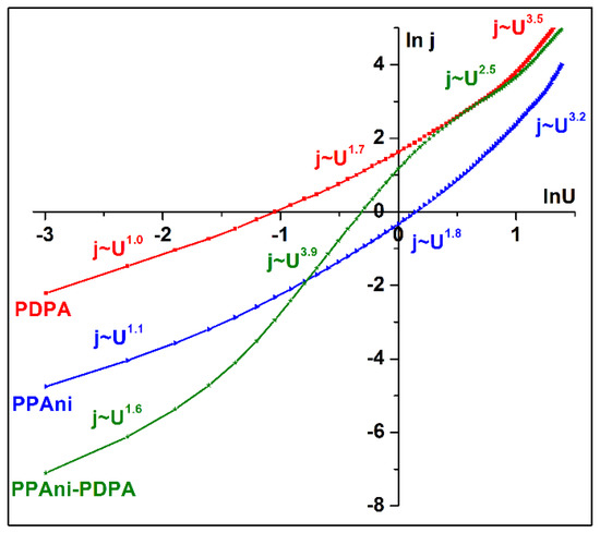To establish the possibility of the appearance of the Schottky barrier effect for these configurations, the graphs j vs. U1/2 (Figure 12a) and lnj vs. U1/2 (Figure 12b) were plotted. From the characteristics, it was highlighted that only the PPAni and PDPA structures present a lnj vs. lnU dependence close to the linear behavior characteristic of Schottky behavior. The PPAni-PDPA structure presents two distinct regions, depending onlnj vs. lnU, that present characteristics close to a linear behavior with a large difference between the slopes of lnj vs. lnU in the two regions; this fact indicates a weak Schottky behavior.