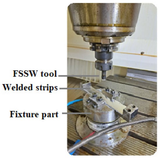 Overlapping Al 1050 strips were welded at the German Computer Numerical Control (CNC) Vertical Machining Center with a developed welding fixture for maintaining the welding spot in the middle of the overlapping region, as shown in Figure 3. The fixture’s holding tray was subsequently placed on top of the load cell. A circular cylinder-shaped temperature sensor was installed in the middle of the grip plate, with a 1.5 mm gap between the Al 1050 welding strip and the temperature sensor. A welding strip, holding bracket, grip plate assembly, and holding screws comprised the holding tray. The designed welding fixture’s primary goal was to keep the welding point in the central overlapped area of the Al 1050 strip. The NI-USB-6341 data capture device was employed to gather temperature and welding force measurements corresponding to the welding stroke.