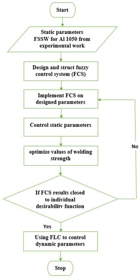 A fuzzy logic control system (FLCS) was used to optimize the strength of FSSW by controlling the static parameters of the welding process. The results of the fuzzy system were compared with individual desirability function results to determine the feasibility of using the FLCS technique to optimize the welding strength by controlling the dynamic parameters’ values for the same welding material (Al 1050). A flow chart of the FLCS used is shown in Figure 5.