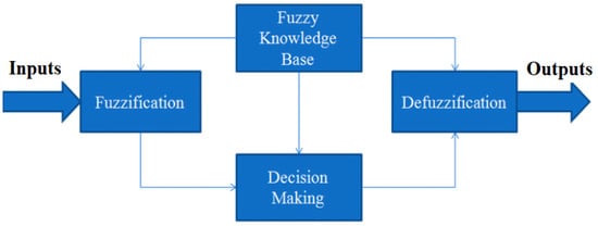 The fuzzifier (fuzzification step), information base, fuzzy principal base (fuzzy knowledge base), and defuzzifier (defuzzifization step) are the fundamental components in the construction of a fuzzy system regulator for any controlled framework, as shown in Figure 6.