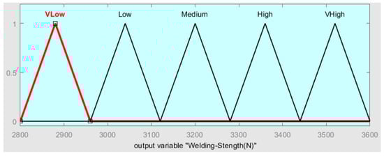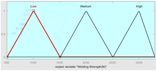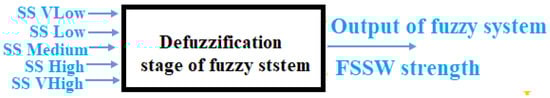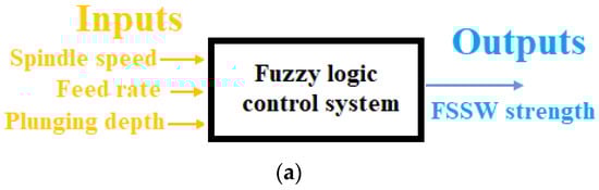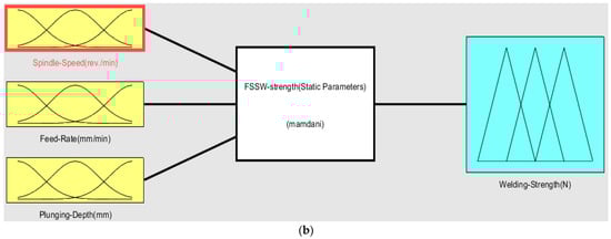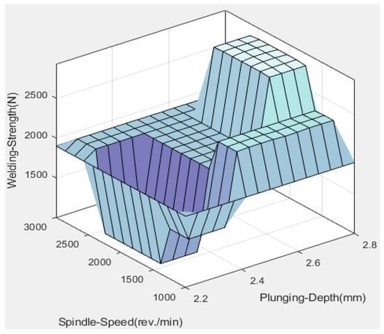 A three-input–one-output fuzzy logic control system is designed and implemented to optimize the friction stir spot welding strength of Al 1050 samples by controlling the values of static parameters (SS, FR, PD) of the welding process. Spindle speed (SS), feed rate (FR), and plunging depth (PD) were the inputs and welding strength was the output of the fuzzy system. The structure of the FSSW strength fuzzy system is shown in Figure 7.