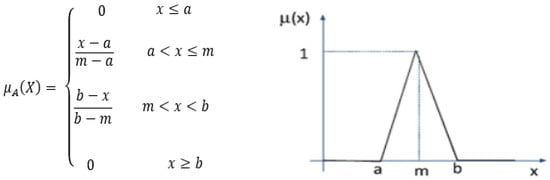 The fuzzy set’s function is to reflect the pointer work for old-style sets. It produces a a graphical fuzzy set representation (A) for debate (X) as µA:X → [0, 1], and this means that the value between 0 and 1 is mapped to (X). The (x) axis is the universe of debate, while the (y) axis is the degree of membership in the [0, 1] set. The mathematical form for a triangular membership function is shown in Figure 8, where a and b are the lower and upper limits, respectively [44].