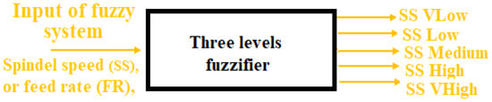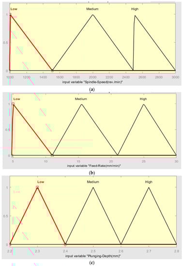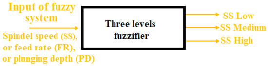 Through the fuzzification step in the fuzzy system, the quantity of inputs is converted to a fuzzy quantity through identifying the deterministic quantities as completely nondeterministic. The triangular membership function used to fuzzify inputs to three levels (low, medium, and high) of fuzzy input values, as shown in Figure 9. The range of fuzzy system inputs (SS, FR, PD) with three levels, low, medium, and high, is shown in Figure 10 and Table 6, respectively.