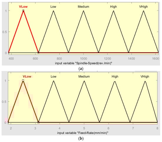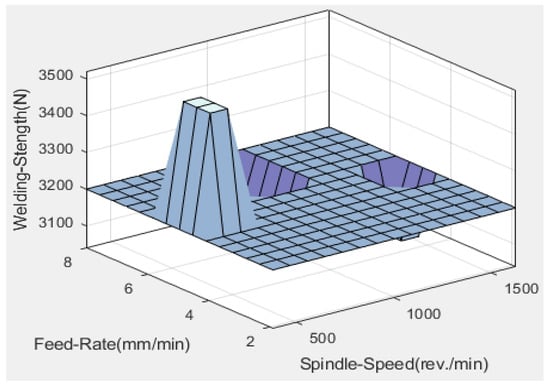 A two-input–one-output fuzzy system was designed to be implemented on the dynamic parameters (spindle speed and feed rate) to optimize the strength of friction stir spot welding for Al 1050 alloy samples. The model of the FSSW strength (dynamic parameters) fuzzy system is shown in Figure 14.