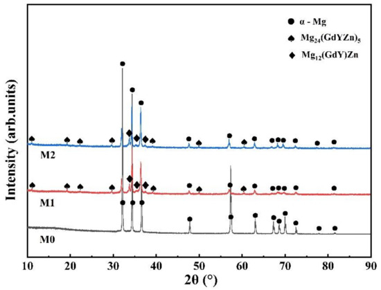 The XRD patterns of all fabricated materials are shown in Figure 1. It can be found that these main diffraction peaks of material M0 correspond to the typical α-Mg matrix phases [16]. After doping with Zn, Zr and rare earth elements, these α-Mg matrix phases are also characterized in material M1. In addition, some visible Mg24(GdYZn)5 and Mg12(GdY)Zn phases also appear in this material. Previous researchers have reported that the precipitation sequence of Mg-RE-Zn-Zr alloy aged at 200 °C is (SSSS)→→ [8]. However, the content of the phase in material M2 is too small to be detected by the XRD. Therefore, material M2 is mainly composed of Mg24(GdYZn)5, Mg12(GdY)Zn, and α-Mg matrix phases.