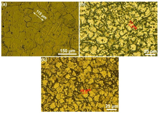 Metallographic images and grain sizes of all fabricated materials: (a) M0, (b) M1, (c) M2.