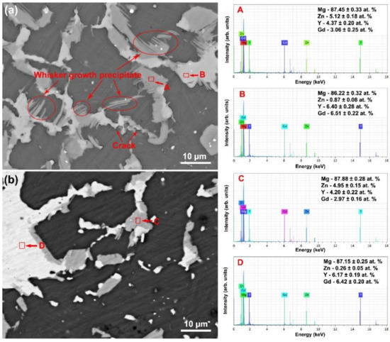 Figure 3a shows the SEM surface image of material M1. Five growth textures are characterized in the SEM image including a dark gray Mg matrix, white bulk, white particle, gray bulk, and gray lamellar phases. Large-size second phase is distributed in the form of a network at the boundaries of the grains, and the white particle phase is scattered inside the grains and the second phase. Previous literature [8,29] reported that white particles usually formed at grain boundaries or in the α-Mg matrix of the Mg-RE-Zn-Zr system, and these white particle phases are mainly attributed to the RE, Zn, and Zr-rich intermetallics. As shown in Figure 3A, the chemical compositions of the gray phase are 87.45 at.% Mg, 3.06 at.% Gd, 4.37 at.% Y, and 5.12 at.% Zn, indicating that the gray phase corresponds to the Mg12(GdY)Zn as determined by the XRD characterization. According to the XRD analysis of Figure 1 and the EDS energy spectrum of Figure 3B, the bulky white phase is attributed to the Mg24(GdYZn)5. As shown in Figure 3a, numerous visible whisker growth morphology of Mg12(GdY)Zn also appear in the grain [30,31]. In addition, plenty of micro-cracks appear at the interface of the eutectic phase and α-Mg matrix, which likely originated from the non-equilibrium solidification process of the Mg24(GdYZn)5 and Mg12(GdY)Zn phases. The SEM surface image of material M2 is displayed in Figure 3b, after the aging treatment, these dark gray Mg matrix, white bulk, white particle and gray bulk also appear in material M2. According to the EDS spectra of Figure 3C,D, these white and gray bulks correspond to the Mg24(GdYZn)5 and Mg12(GdY)Zn, respectively. However, these whisker-like Mg12(GdY)Zn phases dissolve into the interior of the α-Mg matrix. Meanwhile, these micro-cracks hardly appear in material M2. Apparently, this aging treatment drives the composition homogenization of the growth texture and further promotes the fusion of micro-cracks between the matrix and the eutectic phase. According to the previous literature [9,32], the precipitation process of the aged M2 material likely obeys to this evolution of (SSSS) →→.