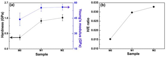 Figure 4 presents the nanoindentation characterization results of all materials. As shown in Figure 4a, the hardness and modulus of material M0 are 0.67 GPa and 43.9 GPa, respectively. Material M1 exhibits a hardness of 1.64 GPa and a modulus of 55.2 GPa. The hardness and modulus of material M2 are 1.83 GPa and 55.8 GPa, respectively. The H/E ratio of all materials is displayed in Figure 4b. It can be found that material M0 possesses a low H/E ratio value of about 0.015, while the H/E ratio increases to 0.03 for material M1, and reaches a higher value of 0.033 for material M2. Apparently, material M1 shows better mechanical properties than material M0, which is mainly attributed to the synergistic strengthening effect of grain refinement, solid solution and second phase. As identified by the metallographic images of Figure 2 and SEM results in Figure 3, the grain size of material M1 decreases significantly, while these eutectic compounds also form at its grain boundaries, both of which effectively inhibit the basal slip [33,34] resulting in an enhanced mechanical property. In addition, the solid solution of doping atoms into the α-Mg matrix is also a key factor in enhancing the mechanical property of material M1. Compared with material M1, this ageing technique drives the structural homogenization of the α-Mg matrix resulting in a prominent solid solution strengthening. Therefore, this strong synergistic strengthening effect of grain refinement, solid solution, and second phase eventually leads to a slight enhancement in the hardness and modulus of material M2 [35]. According to the previous literature [9,36], the formation of phase is also expected to benefit the mechanical property improvement of material M2.