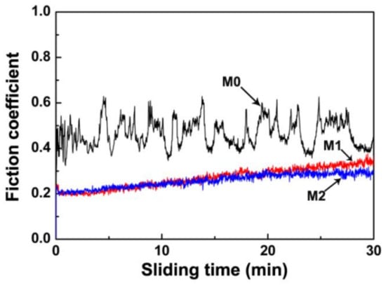 Figure 5 shows the friction curves of all fabricated materials. Material M0 exhibits an unstable tribological performance during the whole sliding wear test, and its friction coefficient fluctuates between 0.35 and 0.60. In comparison, materials M1 and M2 show relatively stable tribological performances during the whole sliding wear tests. The friction coefficient of material M1 slowly climbs from 0.20 to 0.35 with the increase of the sliding distance, while material M2 has a similar evolution law in friction coefficient to material M1, and its friction coefficient gradually increases from 0.20 to 0.3.