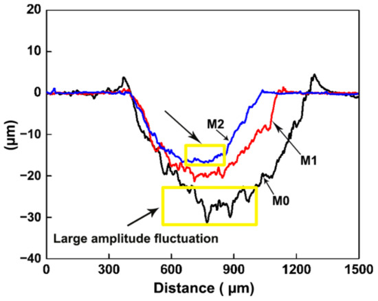The wear track profiles of all fabricated materials are displayed in Figure 6. A large amplitude fluctuation is observed in the wear profile of material M0, indicating an unstable tribological performance. This phenomenon is in accordance with the evolution of the friction curve. The wear track depth and width of material M0 are 31.17 μm and 895.61 μm, respectively, and its wear rate is about 2.64 × 10−3 mm3·N−1·m−1. In contrast, the fluctuation in the wear profile of material M1 obviously decreases. Meanwhile, material M1 exhibits a shallower wear track depth of 20.50 μm and a narrower wear track width of 742.35 μm. The wear rate of material M1 decreases to 1.60 × 10−3 mm3·N−1·m−1. Material M2 possesses the best wear resistance accompanied by a smaller profile fluctuation, but also shows the shallowest wear track depth of 16.79 μm and the narrowest wear track width of 662.38 μm. The wear rate of material M2 is about 1.16 × 10−3 mm3·N−1·m−1. Apparently, the wear resistance of magnesium is greatly enhanced by the alloying and subsequent extrusion-annealing treatment.