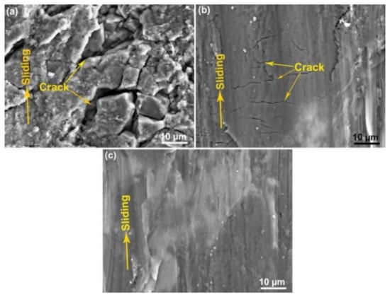 The SEM wear track images of all fabricated materials after the sliding wear tests are shown in Figure 8. As displayed in Figure 8a, the wear track surface of material M0 is characterized by numerous large size cracks, indicating severe structural damage and fracture during the sliding wear test. As shown in Figure 8b, these cracks also appear in the wear track of material M1, but their sizes obviously decrease, indicating an enhanced fracture resistance. In contrast, material M2 shows a smooth wear track morphology (see Figure 8c), without coating fracture or crack initiation, indicating a considerable fracture resistance during the sliding wear test.