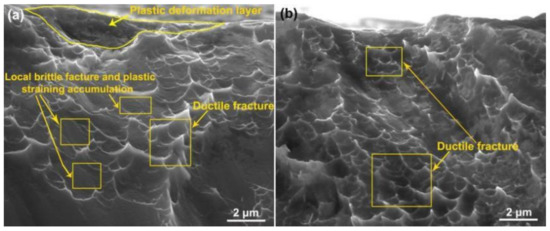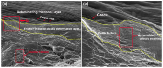 To further investigate the wear mechanism of material M0, SEM cross-sectional characterizations are conducted to clarify the structural evolution of this sample after the sliding wear test. As shown in Figure 9a, the cross-sectional wear track of material M0 exhibits three distinct regions, including a flat fracture morphology, a honeycomb-like fracture morphology, and a fiber-like morphology. According to the previous literature [23,37,38], this honeycomb-like morphology away from the wear track represents a typical ductile fracture characteristic [37], while this flat morphology in the subsurface layer of the wear track represents a typical brittle fracture characteristic [23,38]. Lu et al. [39] reported that frictional contact induces plastic deformation underneath the wear track during the sliding wear test, inducing the formation of delaminating tribolayers, and eventually resulting in a high friction coefficient and wear rate of metals. Apparently, these fiber-like morphologies and visible fatigue cracks in Figure 9a confirm the formation of a plastic deformation layer in the wear track during the wear test. According to the partially enlarged view of the wear track in Figure 9b, it can clearly explain the fracture failure mechanism of material M0 during the sliding wear test. The continuous contact load and repeated sliding wear induce a significant plastic strain on the surface of material M0, as shown in Figure 9b, these plastic strains propagate and accumulate in the subsurface layer of the wear track resulting in the formation of a plastic hardening layer [39]. When the friction-induced shear stress exceeds the yield limit of magnesium, the plastic deformation layer shows poor stability, and shear instability usually occurs, which induces the initiation of cracks in the deformation layer. Subsequently, these cracks propagate inside the deformed layer and finally cause local material spalling [39]. Therefore, a large-scale block shedding of the material can be observed on the wear track surface of material M0 (Figure 8a). Moreover, the severe material fracture and spalling eventually lead to a fluctuated friction coefficient during the sliding wear test (Figure 5).