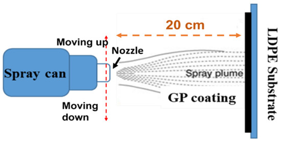 Using Graphit 33, a commercial lacquer produced by kontakt Chemie (Zelecity, Belgium), spray technology was exploited to deposit large area graphite-based films on glass and LDPE substrates. LDPE substrates of size 15 cm × 15 cm × 90 μm were produced by Sabic (Riyadh, Saudi Arabia, 99.77% by weight, Mn = 280,000 g·mol−1, melt flow index of 7 g/10 min and crystalline fraction (Xc) of 32.8%), while glass substrates (SiO2) of size 2.5 cm × 7.6 cm × 1 mm were fabricated by Pearl, Inc. (West Hollywood, CA, USA). Figure 1 shows the scheme of the apparatus used for the spray technique.