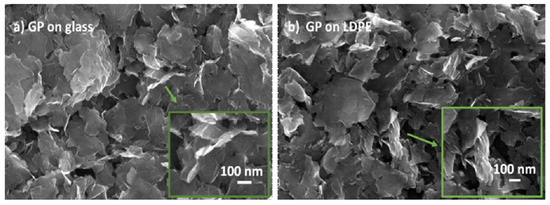 The surface morphology of the samples was investigated by SEM. The micrographs of two films deposited on glass and LDPE substrates are shown in Figure 3a,b, respectively. SEM micrographs reveal that the films on both substrates are composed of aggregated graphite platelets (GP) having a tendency to align parallel to the LDPE/film interface but arranged in a rather disordered way and partially overlapping. GP are irregular in shape, with a broad distribution of lateral dimensions ranging from a few hundreds of nanometers to a few micrometers. Although the platelets tend to align parallel to the interfacial plane, it can be observed that platelets tilted with respect to the substrate plane (as in the insets of Figure 3) make the surface of the films rough and porous. SEM analysis reveals that films deposited on the different substrates exhibit a similar surface structure.