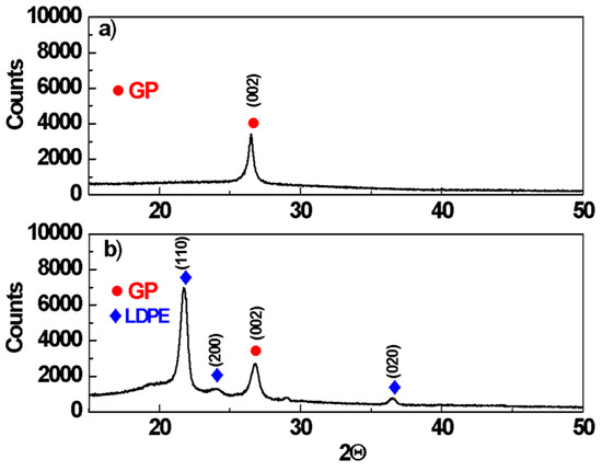 On the other hand, the XRD diffractogram of the film deposited on LDPE and displayed in Figure 4b includes both LDPE and graphite diffraction peaks. Three peaks assigned to the crystalline phase of LDPE [32], superimposed on a large halo generated by the amorphous polyethylene phase [33,34], can be identified: a dominant sharp peak at 2θ = 21.79°, a weak broad peak at 2θ = 24.05° and one more weak peak at 2θ = 36.57° corresponding, respectively, to (110), (200) and (020) crystallographic planes. In addition, a peak of low intensity at 2θ = 26.74° due to the graphite (002) plane [ICDD: 75-1621] is also detected.