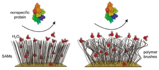 Instead, the interfacial water that strongly binds to the molecule plays a critical role in the resistance to biomaterials. The polar groups on the surface form a hydration layer via hydrogen bonding. Adsorbing biomolecules to this surface simply involves the disconnection of hydrogen bonds between water and the surface followed by replacement with the functional groups of biomaterials; this process is not thermodynamically favorable []. From this point of view, researchers have focused more on the importance of the water layer in hydrophilic SAMs and their resistance to protein adsorption. Whiteside et al. reported a study of the adsorption of four proteins to SAMs on gold []. In this pioneering work, SAMs derived from thiols of HS(CH2)10CH3 and HS(CH2)11(OCH2CH2)nOR, in which n = 0–17 and R = H or CH3, were tested to investigate the effects of the length and number of ethylene oxide (EG) groups on protein resistance. The data showed that relatively densely packed SAMs with a few EG units (at least two EG units) effectively resist protein adsorption and concluded that the steric repulsion theory does not critically contribute when attempting to fully understand protein resistance. This observation clearly demonstrated that SAMs could cover a large number of chains per unit surface area with shorter chain lengths than those of other techniques for antifouling purposes.