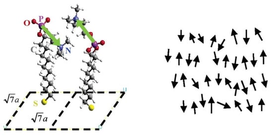 These results demonstrated that one of the prerequisites for zwitterionic SAMs to exhibit protein resistance is electrical neutrality. Jiang et al. also reported the strong resistance of phosphorylcholine (PC) SAMs to protein adsorption using both experimental and molecular simulation techniques []. The generated zwitterionic PC SAMs were evaluated with the adsorption of fibrinogen and BSA. PC SAMs are highly resistant to proteins according to the SPR data; the amount of adsorption to the surface was 0.03 mg/m2 and 0.01 mg/m2 for fibrinogen and BSA, respectively. The researchers stated that the key factors resulting in a strong resistance of zwitterionic SAMs included minimized dipole interactions and balanced charges. Based on the XPS spectra, the PC SAMs had negative and positive charges at a 1:1 ratio and these SAMs exhibited a higher antifouling with fibrinogen compared to that of the SAMs at a ratio of 0.87:1. Furthermore, the molecular simulation results showed that the orientation of the PC headgroups is parallel to the gold surface and that the headgroups favor an antiparallel orientation to each other to minimize the net dipole moment, as shown in Figure 5.
