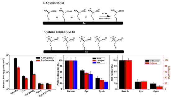 This conformation was supported by the experimental data. The thicknesses of the PC SAMs were measured by ellipsometry and AFM and were 9 Å and 14 Å, respectively, which is significantly lower than the expected thickness of PC SAMs (21 Å). Therefore, it is expected that the orientation of the PC headgroups lies perpendicular to the surface normal. In 2015, Huang et al. developed an L-cysteine-derived zwitterionic molecule (L-cysteine betaine) and investigated the antifouling properties of the corresponding SAMs []. In contrast to L-cysteine (Cys), L-cysteine betaine (Cys-b) has a durable zwitterionic form from pH 3.4 to 10.8 and the quaternization of the amine group efficiently reduces photoinitiated oxidization (Figure 6). The researchers conducted fouling resistance tests with SAMs from Cys and Cys-b on gold in bacteria, proteins, and mammalian cells. For the bacterial resistance test, the film generated from Cyc-b showed higher antifouling properties even after photooxidation, while Cys SAMs adsorbed a higher number of bacteria (Figure 6, left). Moreover, the results demonstrated the greater ability of the Cys-b-coated surfaces to resist the adsorption of mucin, lysozyme, and BSA compared to the Cys SAMs (Figure 6, middle). The study of the adhesion of mammalian cells also indicated that NIH 3T3 cells adsorbed more on Cys-based SAMs than on Cys-b SAMs (Figure 6, right). The higher antifouling system of Cys-b SAMs can be rationalized by the fact that the association of quaternary ammonium and carboxylate groups is attributed to strong hydration, low self-association of ionic groups, and low electrostatic attraction to proteins according to the molecular simulation study [].
