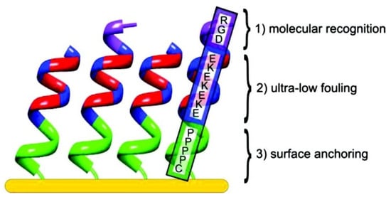 Three gram-positive bacteria (L. ivanovii, E. faecalis, and S. aureus) were deposited on Au-MUA-MAG (Magainin I modified film) or Au-MUA (without Magainin I) at 37 °C for 3 h. The surface modified with Magainin I (Au-MUA-MAG) effectively inhibited the adhesion of each gram-positive bacterium, preventing 80% of L. ivanovii cell attachment compared to that of the untreated surface (Au-MUA). Moreover, the antibacterial activity of the Margainin-functionalized surfaces persisted even after 6 months. The researchers suggested that Magainin induced the formation of pores in the lipids of targeted cell membranes, leading to microorganism cell lysis and they confirmed the observation that the adhered bacterial cell surface deteriorated with the collapse of cell walls. Zwitterionic peptides can provide another way to prevent biofouling, as water molecules are strongly bound via electrostatic interactions with peptide residues []. Nowinski et al. reported an ultralow fouling monolayer on a gold surface with alternating negatively charged glutamic acid (E) and positively charged lysine (K) residues []. The structure of SAMs in this study was composed of (1) a cysteine (C) residue as an anchor to bind gold, (2) four proline (P) linker residues, which provide hydrophobicity and helical secondary structure, (3) an alternating glutamic acid (E) and lysine (K) sequence to form a strong hydration layer and (4) an arginine–glycine–aspartate (RGD) sequence mimicking extracellular matrix proteins as a biomolecular recognition (Figure 7). To compare the impact of rigid and hydrophobic proline linker (EKEKEKE-PPPPC), the researchers used the flexible and hydrophilic glycine residue as a linker (EKEKEKE-GGGGC) as well as the linker-free peptide (EKEKEKE-C). SPR data show that the fouling of fibrinogen to the EKEKEKE-PPPPC SAMs is 4.4 ± 2.9 ng/cm2, while it is 17.9 ± 11.4 ng/cm2 for the EKEKEKE-GGGGC SAMs and 38.3 ± 2.9 ng/cm2 for the EKEKEKE-C SAMs. To study the different amounts of fouling in greater depth, the researchers examined the secondary structure of each peptide in solution using circular dichroism (CD), molecular dynamics (MD) simulations, and attenuated total internal reflection Fourier transform IR spectroscopy (ATR-FTIR). The CD, MD, and ATR-FTIR data supported that the proline linker contained an extended and rigid helical structure, allowing peptide chains to pack well with each other, while the linker-free (EKEKEKEKE-C) and glycine linker (EKEKEKEKE-GGGGC) peptides exhibited disordered structures, compromising their antifouling properties.