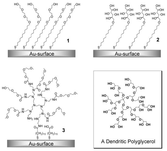 In 2001, Ostuni et al. investigated SAMs that contain different functional groups and their protein resistance via SPR []. In these studies, the functional groups, which showed acceptable results for the prevention of protein adsorption, exhibited the following molecular-level characteristics: (1) the group is hydrophilic, (2) the group includes hydrogen bond acceptors but does not have hydrogen bond donors, and (3) the overall electrical charge is neutral. In particular, the researchers used multiple amine functional groups, such as glycine and sarcosine, and replaced one of the hydrogen atoms on the amino group with a methyl group to test the effect of hydrogen donors on protein resistance; the substitution reduced protein adsorption to the surface. However, a molecular exception to these general requirements was reported [,]. Specifically, in 2000, Luk et al. reported that mannitol-terminated SAMs are remarkably effective for producing inert surfaces against protein adsorption and cell adhesion []. The authors generated films possessing terminal mannitol groups (Figure 8, surface 2) that were comparable to OEG monolayers (Figure 8, surface 1) in repelling five proteins, including fibrinogen pepsin, lysozyme, insulin, and trypsin. Moreover, the mannitol SAMs maintained good anti-adherent of cells over 25 days, while the OEG SAMs failed after 7 days. Molecular simulation results suggest that mannitol SAMs are tightly bound with water and that the hydration layer generated a strong repulsive force on the approaching proteins despite the presence of hydrogen bond donor groups []. Along with the mannitol group, Siegers et al. also studied the nonspecific protein adsorption of dendritic polyglycerol SAMs, which contain several hydrogen bond donors []. The dendritic polyglycerol SAMs exhibited an effective inertness to fibrinogen adsorption compared to that of the OEG SAMs and showed more protein resistance than that of a commercially available dextran-based sensor chip. In addition to their antifouling ability, dendritic polyglycerols also exhibited higher thermal and oxidative stability than PEG. Dendritic polyglycerols contain the following structural features that are typical of protein-resistant surfaces: (1) hydrophilic repeating units, which are water-soluble, and (2) a very flexible branched structure, which leads to high protein resistance (Figure 8). Excellent resistance against protein absorption was observed with those features, even though molecules with hydrogen bond donor OH groups were opposed to the general rule for the inert surfaces.
