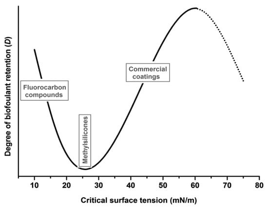 There are two general strategies by which surface modification inhibits biomaterial adsorption: (1) prevention of biomaterial attachment and (2) detachment of biofoulants []. In the strategy involving the prevention of biomaterial attachment, settlement of biomolecules on the surfaces is avoided such as using a strong hydration barrier as we discussed above. On the other hand, the strategy involving the detachment of biofoulants provides only a weak connection between the surface (mainly the hydrophobic surfaces) and the biomaterials. Thus, the goal of the strategy is to reduce adhesion by removing the settled organisms from the surface using stresses such as the hydrodynamic flow caused by ship movements. Removing marine organisms from hydrophobic surfaces has a strong relationship with the low surface energy of materials. The correlation between the relative adhesion of biomaterials and the surface energy of the polymer was reported by Baier []. The Baier curve has been used to depict the degree of biofouling adhesion as a function of the critical surface tension (Figure 9).
