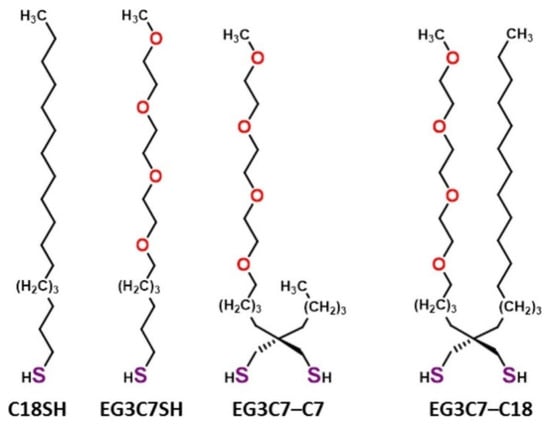 Recently, Chinwangso et al. developed and characterized the properties of thin films that are composed of chemically disparate species []. In the study, new unsymmetrical spiroalkandithiol adsorbates having within one molecule a chain possessing three EG units and another chain possessing an alkyl group.  These adsorbates were designed to overcome the issue of phase separation that was generated from the co-adsorption of two separate monodentate adsorbates (Figure 11).