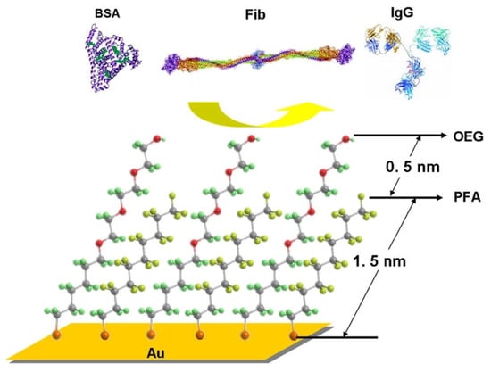 Illustration of amphiphilic binary SAMs on gold and three proteins (BSA, Fib, and IgG) []. Copyright 2013 Elsevier Inc.