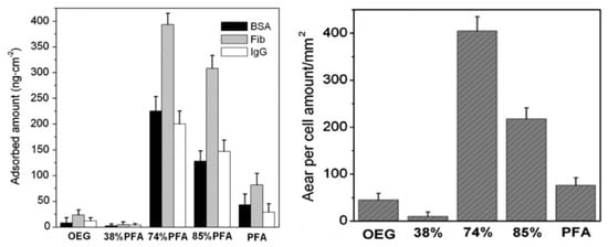 Protein (BSA, IgG, and Fib) adsorption (left) and cell adhesion (right) on amphiphilic binary SAMs with different PFA fractions []. Copyright 2013 Elsevier Inc.