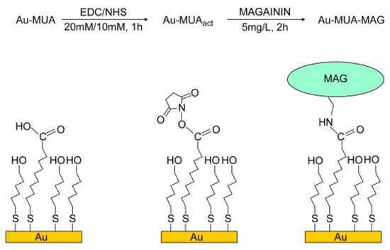 Magainin I immobilization on gold []. MUA: 11-mercaptoundecanoic acid; EDC: 1-(3-dimethylaminopropyl)-N’-ethyl-carbodiimide hydrochloride; NHS: N-hydroxysuccinimide. Copyright 2009 Elsevier Ltd.