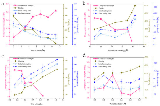 The effects of metakaolin, spent resin loadings in wasteforms, water-binder (w/b) ratios, and water reducer dosages on the solidification performance were investigated and the results are shown in Figure 1. Metakaolin dosage is the major concerning factor (Figure 1a) for its pozzolanic reactivity. The 7 day compressive strength increased with the increase in metakaolin dosage, indicating that the secondary hydration of the metakaolin improved the microstructure and then enhanced the mechanical properties and durability of the solidified wasteforms at the macroscopic level [30]. At the same time, metakaolin reduced the fluidity significantly and shortened both the initial and final setting times of the paste. The trends of strength, fluidity, and setting times indicate that metakaolin boosted the hydration reaction rate of the sulfoaluminate cementitious system to facilitate the solidification. In terms of operating parameters, with no metakaolin addition, the fluidity reached 300 mm, which makes the resin beads subject to a decreasing fluid resistance in the paste and keep floating up and gathering in the upper part of the paste. The floating resin beads were delaminated with the cement during a period around 100 min before the initial setting, which is one of the reasons for the low compressive strength in this case. Owing to appropriate metakaolin dosages, it was also facile to blend the paste uniformly and fill the mold without large bubbles with fluidity between 150 mm and 200 mm, which meets the needs of solidifying procedures. The setting times for paste containing metakaolin were also within a reasonably acceptable range, with the initial setting time for sufficient stirring being no less than 40 min and the final setting time for minimizing delay on subsequent processing steps and personnel exposure risk being no more than 90 min.