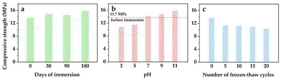 Compressive strength of optimized solidified wasteforms after (a) immersion of different days (pH = 7, 25 ± 5 °C), (b) 90 day immersion under different pH (25 ± 5 °C), and (c) freeze–thaw cycles, with the mixture composition of spent resin 40 wt.%, sulfoaluminate cement 55.8 wt.%, metakaolin 2.2 wt.%, and naphthalenesulfonate water reducer 2 wt.%.