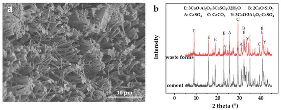 Characterization of metakaolin-reinforced wasteforms: (a) SEM image and (b) XRD spectra (red), with the mixture composition of spent resin 40 wt.%, sulfoaluminate cement 55.8 wt.%, metakaolin 2.2 wt.%, and naphthalenesulfonate water reducer 2 wt.%; the hardened cement XRD spectra (black) as comparison, with the mixture composition of water 40 wt.%, sulfoaluminate cement 55.8 wt.%, metakaolin 2.2 wt.%, and naphthalenesulfonate water reducer 2 wt.%.