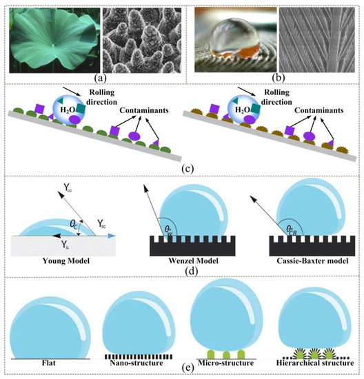Typical hydrophobic mechanisms of superhydrophobic surfaces in nature: (a) SEM images of lotus leaf surfaces [34]; (b) SEM images of bird feather surfaces [35]; (c) self-cleaning mechanism of superhydrophobic surface [36]; (d) liquid droplet on solid surfaces, representing the Young, Wenzel, and Cassie–Baxter models [37]; (e) different types of surface roughness and wettability [38].