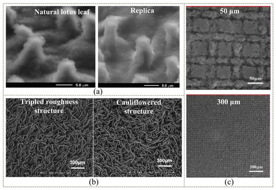 Preparation effects of the template method: (a) SEM images of the natural lotus leaf and its positive replica [53]; (b) SEM images of superoleophobic rough fibrous structures of high–density polyethylene (HDPE) [65]; (c) SEM images of the flexible tube [66].