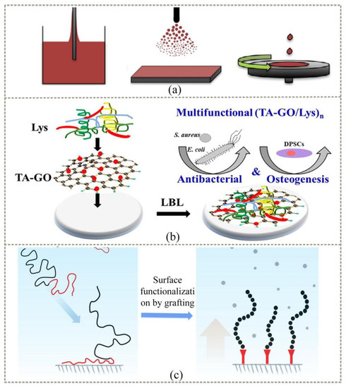 Different methods of attaching antibacterial coatings to material surfaces: (a) infiltrate, spray, and rotate [93]; (b) layer-by-layer self-assembly [94]; (c) surface grafting [95].