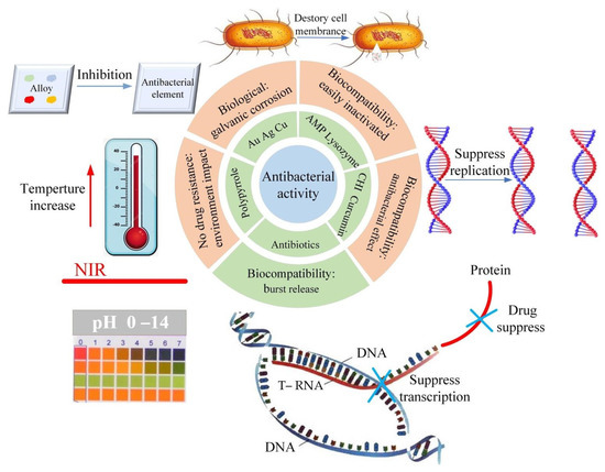 Intelligent antimicrobial coatings [91,92] achieve controllable antimicrobial processes, maintain “biological inertia” when there is no bacterial contact, can “activate” bactericidal function and release antimicrobial agents in the early stages of bacterial adhesion, and can achieve controlled release of antimicrobial agents by regulating intermolecular interactions and intelligent responsiveness. Intelligent antibacterial coating can effectively avoid the environmental pollution and health hazards caused by the irregular loss of toxic components such as heavy metals and antibiotics. In addition, intelligent antimicrobial coatings can quickly remove the dead bacteria and debris on the surface after killing bacteria through the intelligent responsiveness of the coating molecules (temperature, pH, light, magnetism, etc.) to maintain the long-term antibacterial function of the coating.