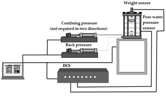 The dynamic triaxial apparatus system DYNTTS made in England was adopted in the tests, whose composition is shown in Figure 1. Specifically, the data acquisition system consisted of a distributed control system (DCS) signal receiver, an axial force sensor, and a pore water pressure sensor, and the external control system was composed of an axial force controller, a pressure chamber, a confining pressure controller, and a back pressure controller.