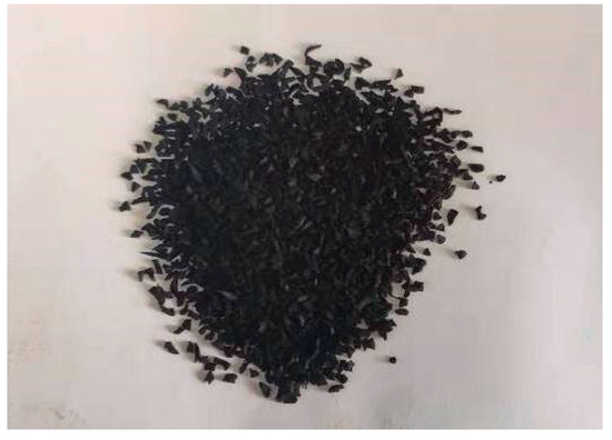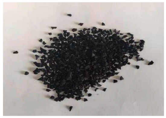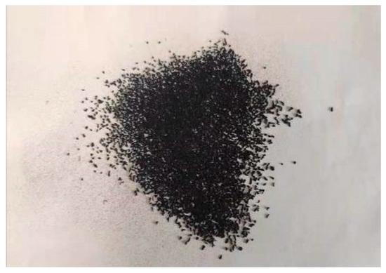 (1) Rubber particles. The rubber particles used in this test were produced via the normal temperature crushing method. Screened by the vibrating screen in the laboratory, the following three kinds of rubber particles with average particle sizes of 0.75 mm, 1.5 mm, and 2.5 mm, respectively, were mainly utilized, as shown in Figure 2, Figure 3, Figure 4 and Figure 5.