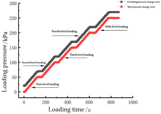 (2) Sample saturation: Water head saturation and back pressure saturation were utilized to saturate the samples, thus improving the saturation of the rubber-mixed sand samples. First, water head saturation was performed. Specifically, the drain valve of the apparatus base was connected with that of the water container. Then, the drain valve of the container was opened so that the boiled and cooled distilled water flowed into the bottom from the apparatus base. In this way, the pores between sample particles were filled with water, and the air in the samples was exhausted, thus gradually elevating the saturation of the samples. In addition, excess distilled water flowed out from the top of the samples to the container prepared in advance. After the water head saturation, a small amount of air remained in the samples. However, the air in the samples was melted into water by applying five-level back pressure saturation. Figure 8 shows the five-level back pressure loading change curve. In the process of back pressure loading, the effective confining pressure remained at 20 kPa (the confining pressure remained greater than the back pressure to prevent the sample preparation from being damaged due to the overload of the dynamic pore pressure in the samples, and the five-level loading process could minimize the disturbance of the test apparatus loading on the samples). After the five-level back pressure loading, the saturation of the samples was detected. If the B value , the saturation condition was met. If not, saturation detection was conducted after the samples were re-installed and the saturation process was reloaded.