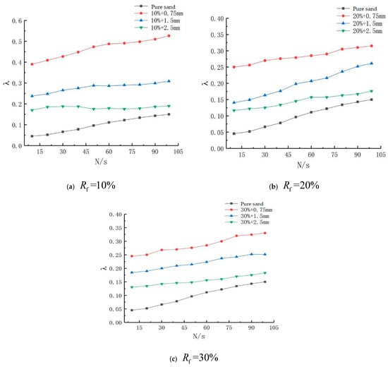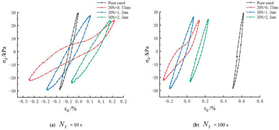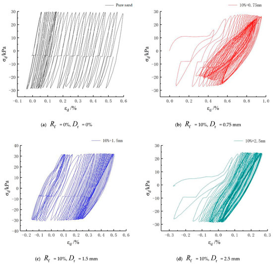 The influence of the mixing amount of rubber particles on the stress–strain relationship is expressed below. Under the cyclic loading, the compressive strain of the pure sand samples continuously increased until it was damaged. The stress–strain hysteresis curve of the rubber-mixed sand samples was similar to that of the pure sand samples because of a small mixing amount of rubber (). However, the samples with and had a stressed skeleton, in which the rubber particles were primary, on account of the large mixing amount of rubber particles, so the stress–strain hysteresis curve showed a totally different changing form from the pure sand. From the specific data in Figure 4, the strain range of the rubber particles in the three sizes was between −0.36% and 0.24% and the tensile and compressive strain was distributed. The strain of the samples with changed from −0.19% to 0.9542% and the compressive strain dominated in the hysteresis curve, which was similar to that of the pure sand.