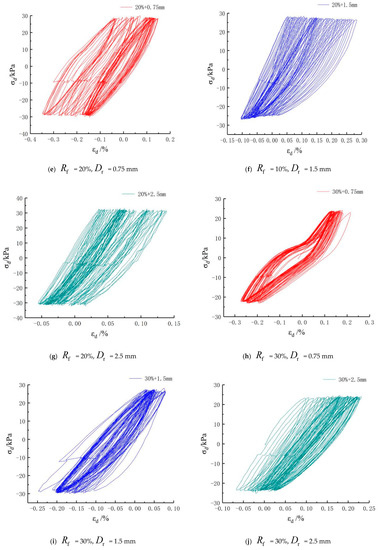 Figure 10h–j represents the images of the hysteresis curves with 30% mixing amount of rubber . The strain ranges of the samples mixed with rubber particles in the three sizes with the three mixing amounts were −0.28%–0.21%, −0.25%–0.06%, and −0.09%–0.23%, respectively. It was never discovered that a relatively large cumulative strain was produced in three groups of samples under cyclic loading. The morphology of the hysteresis curves was similar at each time and the central symmetry points of the hysteresis curves also swung around the original points.