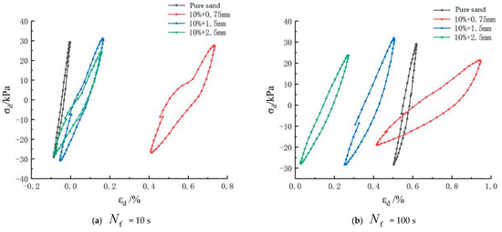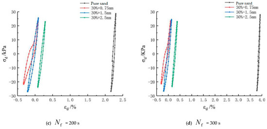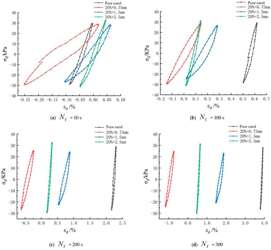 To further study the impacts of a 20% mixing amount of rubber particles on the stress–strain relationship curve, the hysteresis curves of various groups under graded vibration times are listed as shown in Figure 12. Specifically, the samples mixed with 0.75 mm rubber particles had the maximum strains, namely 0.02%, 0.14%, −0.24%, and −0.73%, respectively, under cyclic loading at four times (10 s, 100 s, 200 s, and 300 s), which presented a reciprocating strain form of tension and compression and did not produce a large cumulative strain. The samples mixed with 1.5 mm rubber particles reached the maximum strains, namely 0.06%, 0.27%, 0.87%, and 1.87%, respectively, under cyclic loading at four times (10 s, 100 s, 200 s, and 300 s), whose dynamic strain enlarged as the number of cycles increased and which generated a large cumulative strain. The samples mixed with 2.5 mm rubber particles reached the maximum strains, namely 0.04%, 0.13%, 0.33%, and 0.64%, respectively, under cyclic loading at four times (10 s, 100 s, 200 s, and 300 s), whose dynamic strain developmental rule was similar to that of the samples mixed with 1.5 mm rubber particles and whose dynamic strain was augmented with the increase in the number of cycles. Under 300 times of vibration, the latter only achieved a maximum strain of half of that of the former. Since rubber particles of large size possess a great energy absorption and vibration reducing performance, they could effectively decrease the strain of the samples under cyclic loading when mixed in the sand.