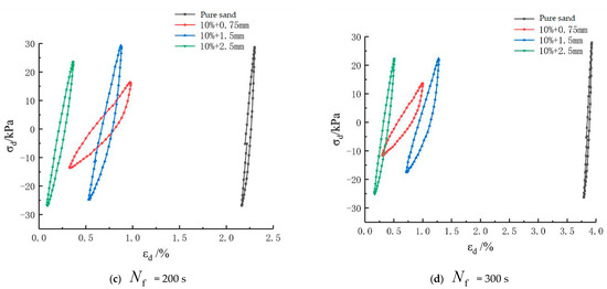 Figure 11a–d is the dynamic stress–strain hysteresis curves of the rubber-particle-mixed-sand samples in the three particle sizes under graded vibration times when the mixing amount of rubber was 10%. The maximum strains of the samples mixed with 0.75 mm rubber particles achieved 0.73%, 0.95%, 0.97%, and 1.12%, respectively, under the cyclic loading at four times (10 s, 100 s, 200 s, and 300 s). The rubber-mixed sand samples in the size of 0.75 mm presented obvious softening under cyclic loading and the encircled area by the dynamic stress hysteresis curve decreased with the increase in vibration time, indicating a reduced energy consumption of the samples. The samples mixed with 1.5 mm rubber particles showed the maximum strains, namely 0.16%, 0.47%, 0.88%, and 1.27%, respectively, under cyclic loading at four times (10 s, 100 s, 200 s, and 300 s). The samples mixed with 2.5 mm rubber particles exhibited the maximum strains, namely 0.15%, 0.26%, 0.36%, and 0.51%, respectively, under cyclic loading at four times (10 s, 100 s, 200 s, and 300 s).