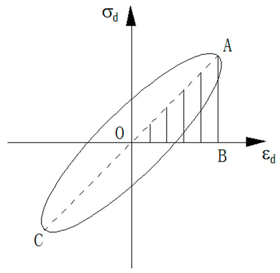 Figure 14 shows a standard dynamic stress–strain curve. A quantitative analysis of the hysteresis curve was conducted to gain the dynamic elastic modulus and the damping ratio . The dynamic elastic modulus of the soil mass was calculated using the slope of the two endpoints A and C on the hysteresis curve in Figure 4, Figure 5 and Figure 6 according to Formula (4).