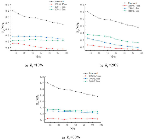 Rubber-mixed sand elastic modulus with different rubber content and size. (a) Rf = 10%; (b)Rf = 10%; (c) Rf = 30%.