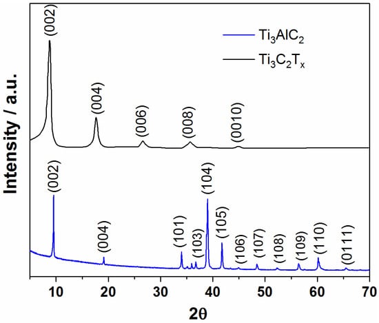 XRD patterns of Ti3AlC2 MAX phase and Ti3C2Tx MXene.
